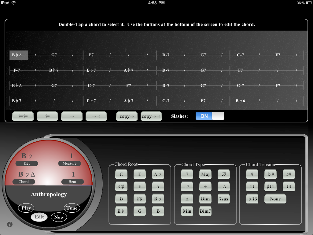 When you tap the “Go” button your new song’s chord chart will be displayed using default chords. You will be in edit mode. Double-tap on each chord to change its root, chord type, and tension. Changes are automatically saved, and your new song can be retrieved from the list of song titles found by tapping “Songs” in Play mode.