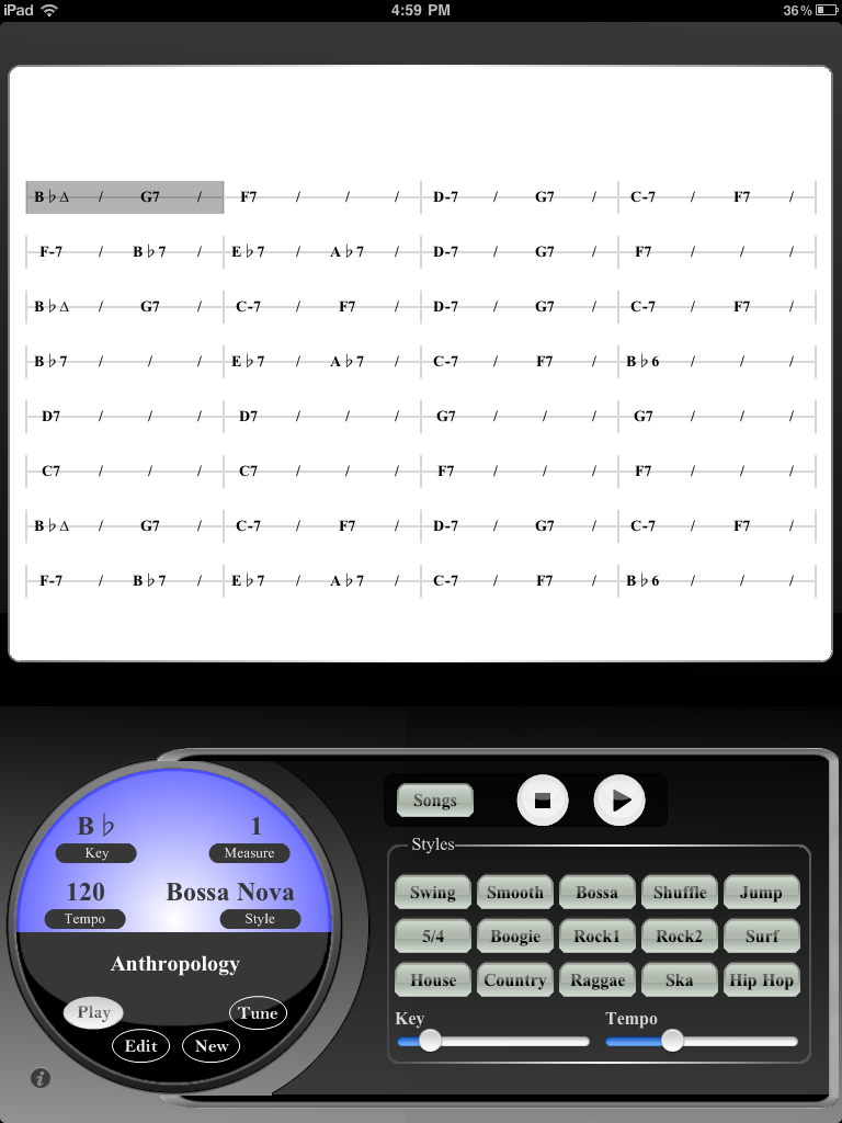 The “Key” and “Tempo” sliders are used to change key and tempo. Tap any of the style buttons to change to another style (“Swing”, “Bossa”, etc.”).