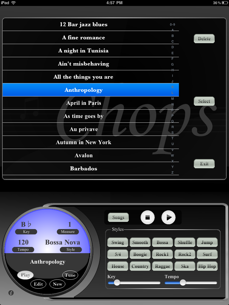 Chops for iPad has 4 modes: Play, Edit, New, and Tuner. Switch to any of these modes by tapping the black “Play”, “Edit”, “New” or “Tuner” buttons.